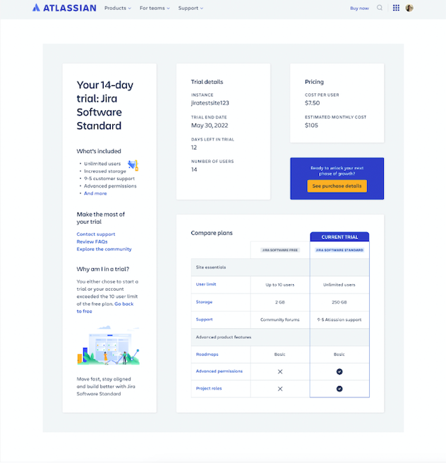 Problem statement: I am an admin that just landed in a JSW standard trial and I am trying to understand and experience how JSW can benefit my team. But, I am unaware of my upgrade details because information around customer limits and upgrades aren’t readily available or apparent as I’m trying out the software, which makes me feel confused.